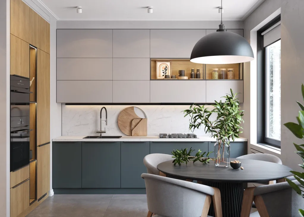 Современный дизайн кухни характеризуется минимализмом, функциональностью и использованием натуральных материалов. В тренде – просторные и светлые помещения, эргономичная мебель и интегрированная бытовая техника.