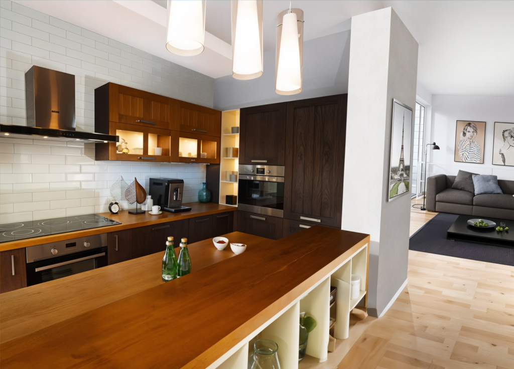 - Остров или барная стойка: Визуально разделяют зоны и служат дополнительной рабочей поверхностью.